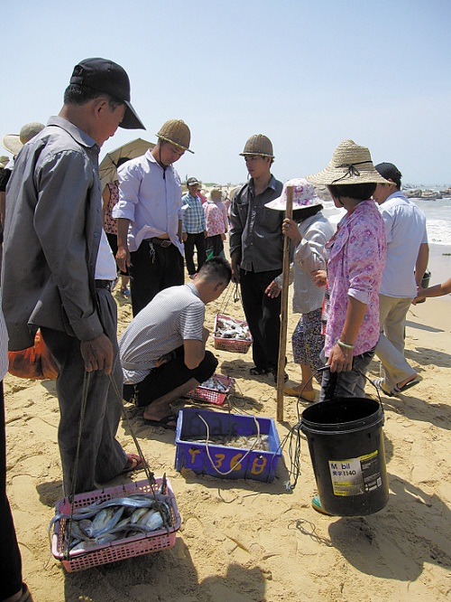 台风“莲花”刚走,勤劳的渔民们就瞅准时机,趁早出海“讨掠”,获得好收成。近日,在惠来县神泉镇芦园村浅海滩,竹排船刚靠岸,鲜活的鱼货立即吸引了许多鱼贩前来抢购(见右图),在一阵阵讨价还价声中成交。划鱼每公斤40元左右,乌脐45元左右,均比平时贵10元以上。尽管价格上涨,还是供不应求。南海伏季休渔以来,由于大量渔船返港歇业,鱼货供应量锐减,惠来县浅海杉竹排渔船出海捕捞的鱼鲜,物以稀为贵,成了“抢手货”,倒是让浅海捕捞的渔民多赚了一把。
