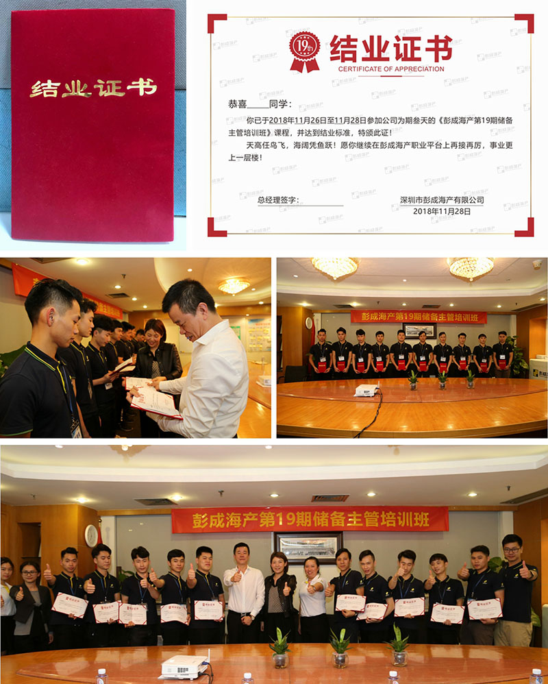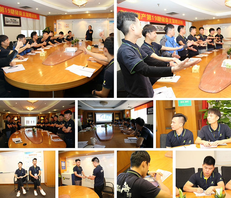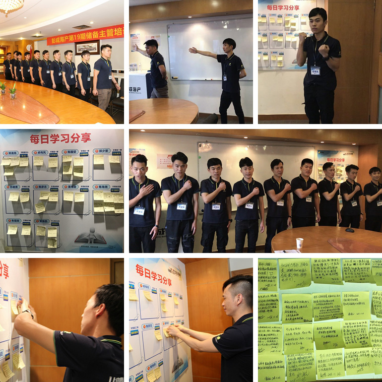 彭成海产22年发展历程,一直重视内外兼修,特别注重员工培训教育与职业成长,多年来结合行业性质及企业背景开创了适合公司的人才培养模式与自有培育体系,与时俱进,不断推陈出新,目前已形成了公司自有特色的文化优势。第19期储备主管培训班结合日新月异的市场环境,经过多元化的升级调整与精心策划,融入军队文化元素,力求打造更规范更标准更有战斗力的彭成精英团队!