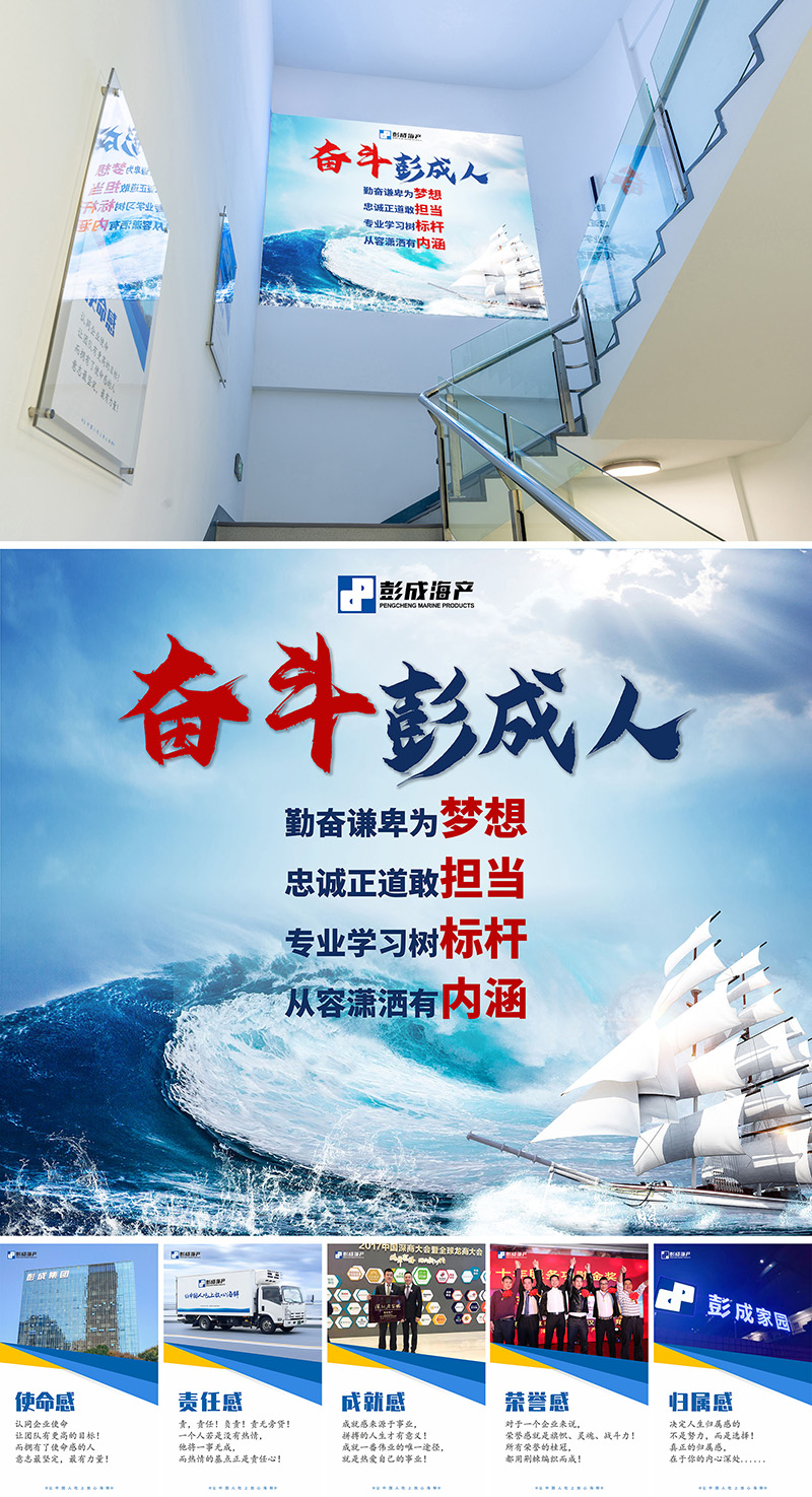 彭成海产平湖园区是集总部办公、生活家园、活鲜暂养、冻品展示、仓储冷链、产品检测、加工包装、分拣配装、物流配送等多功能于一体的综合型园区,一方面升级服务配套硬件设施,加强业务合作支撑,另一方面统一布局规划管理,提升企业品牌形象,为员工营造“幸福生活、快乐工作”的人文氛围,加速实现公司既定战略发展!